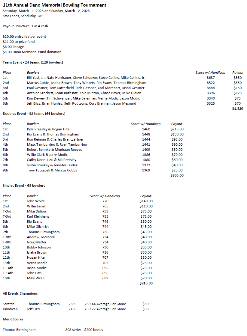 - Team Brian Minton – Bill Yost, Jr., Nate Holzhauer, Steve Schoewe, Steve Collins, & Mike Collins, Jr.